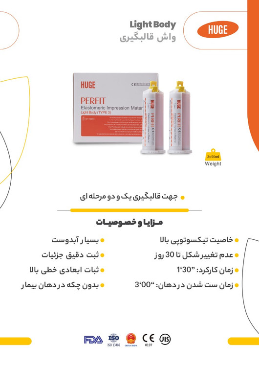 PERFIT Light Body با فرمولاسیون منحصر به فرد خود، سیالیت و پایداری فوقالعادهای را ارائه میدهد. این ویژگیها، همراه با آبدوستی عالی و تیکسوتروپی برجسته، تضمینکننده دقت بیسابقهای در ثبت جزئیات ظریف دهان و دندان است. دیگر نگران حبابهای هوا یا عدم یکپارچگی مواد نباشید؛ PERFIT Light Body سطحی صاف، شفاف و بدون نقص را برای شما به ارمغان میآورد.